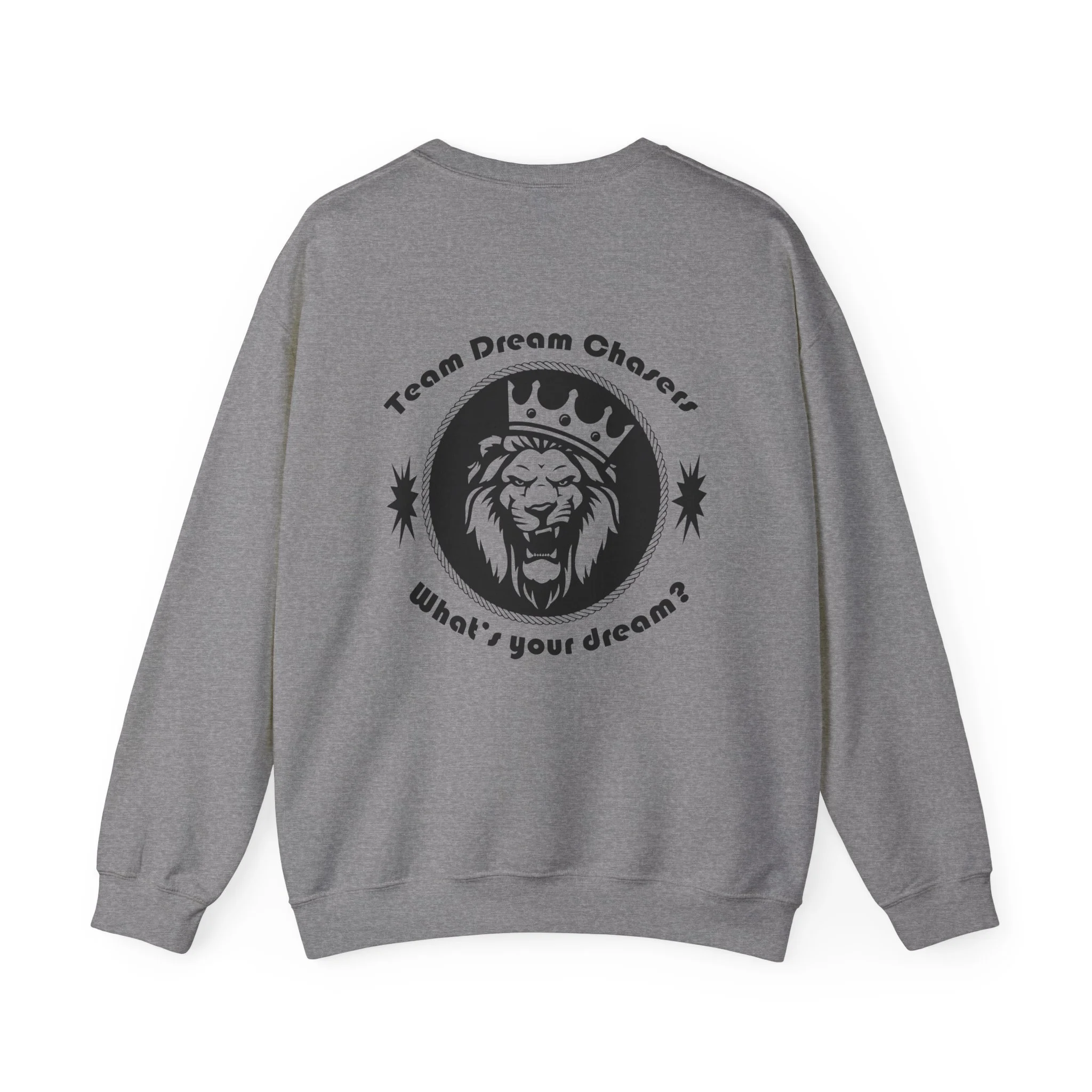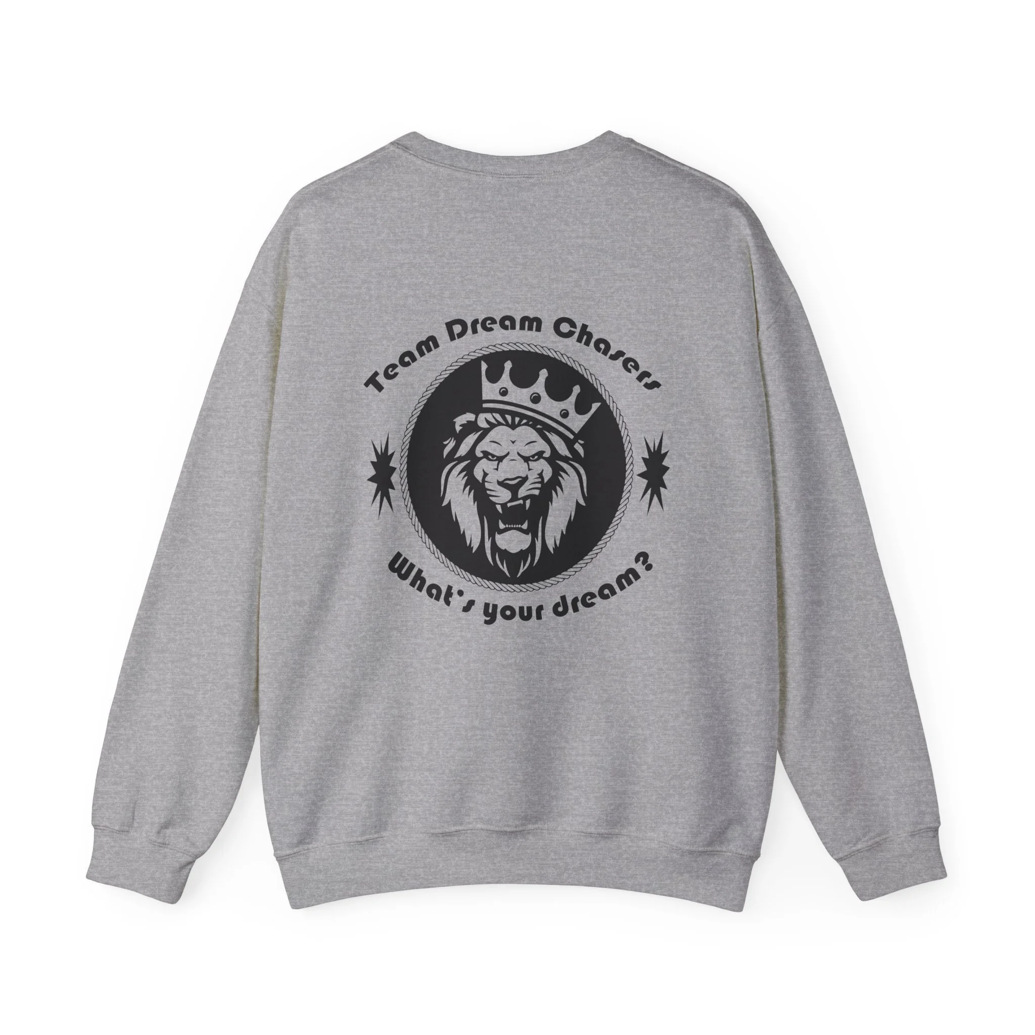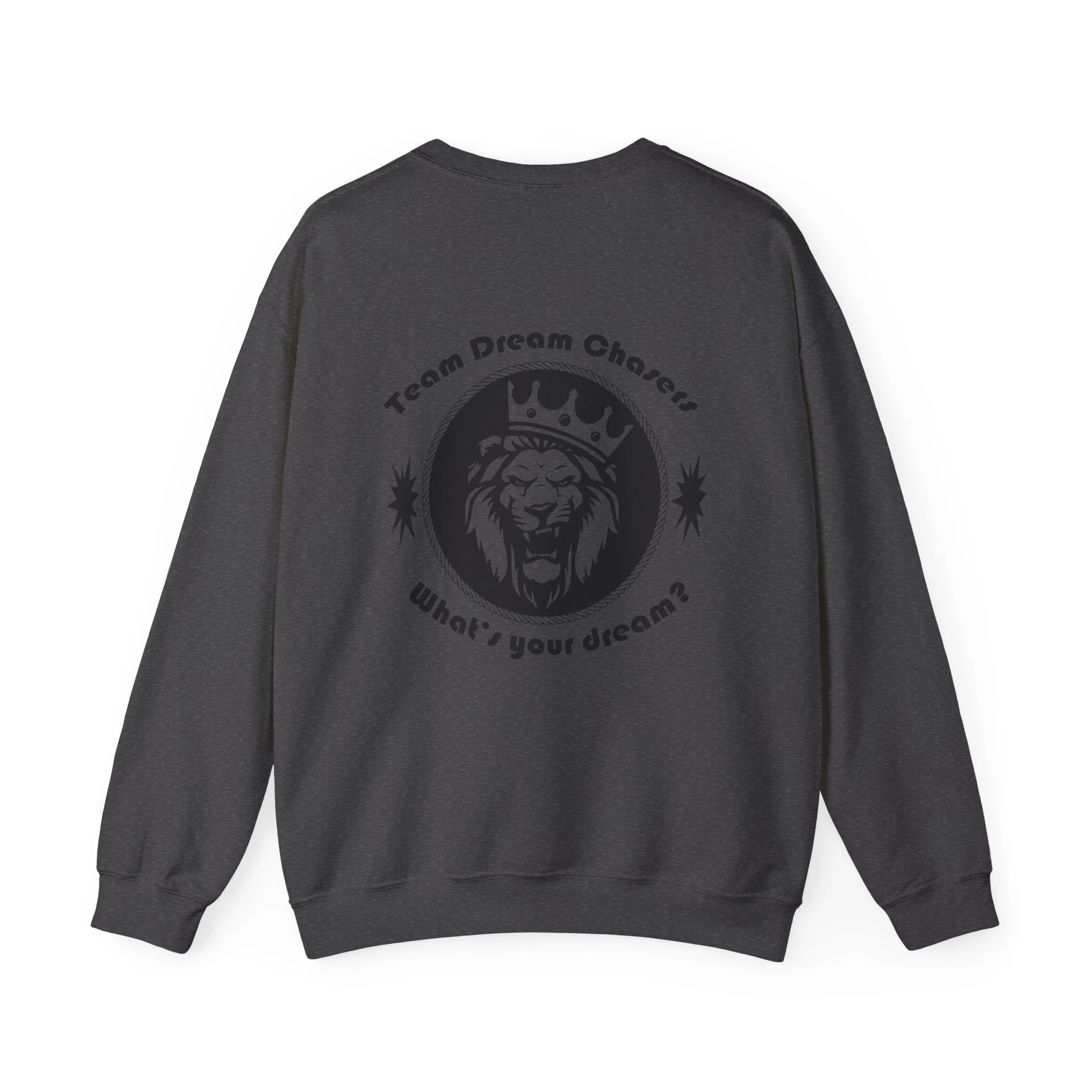 A soft, dependable crewneck that carries quiet confidence. Lightweight but substantial, this sweatshirt drapes cleanly and holds its shape through seasons of wear. The front bears a compact 'TDC Basketball' emblem for understated team pride, while the back centers a bold crowned-lion crest surrounded by the words 'Team Dream Chasers' and the prompt 'What's your dream?'. It feels like the sweater you grab after practice, for late-night drives, or to layer on game day — familiar, durable, and ready to represent the grind. Simple lines and monochrome art give it a street-ready, team-focused vibe that fits both warmups and weekend hangs.