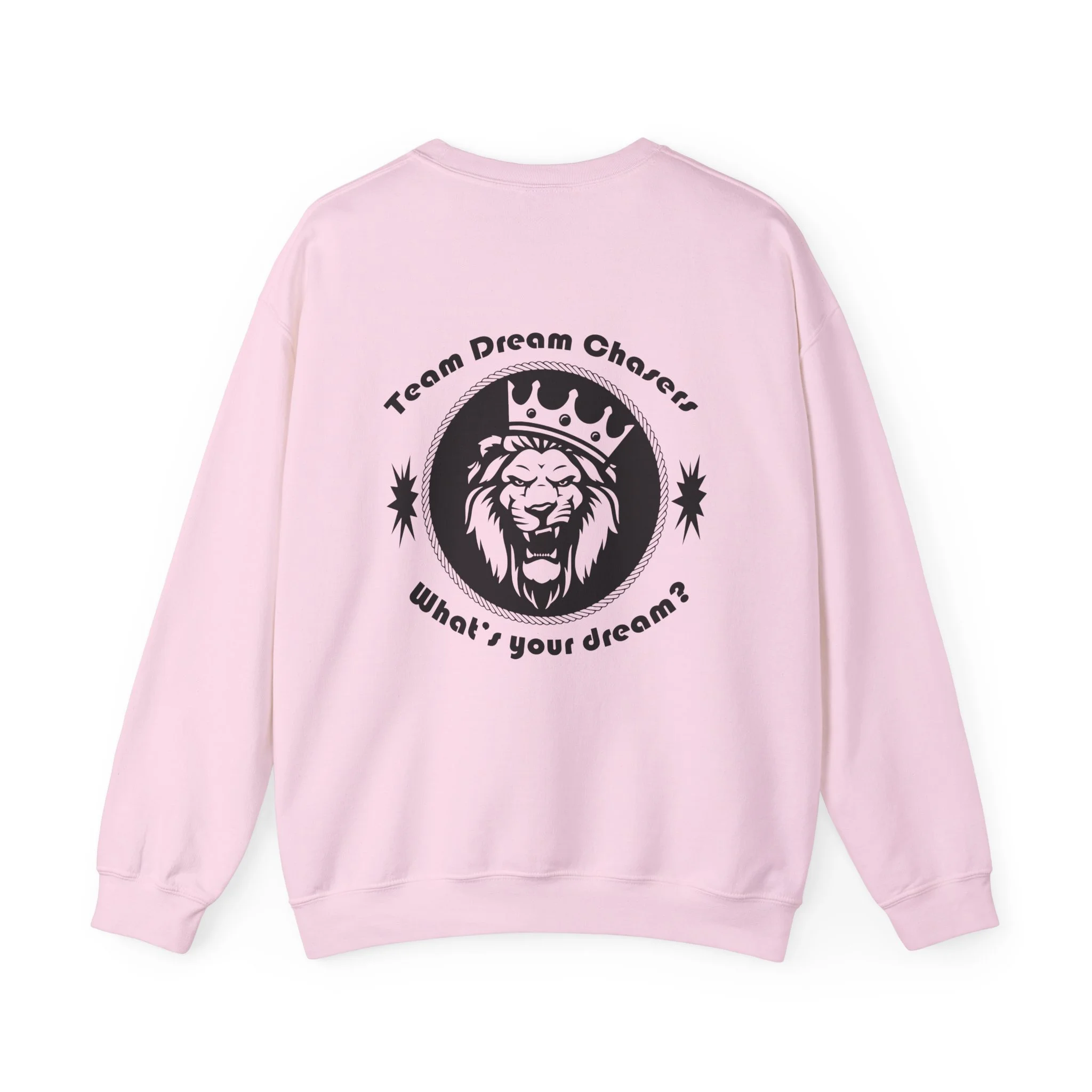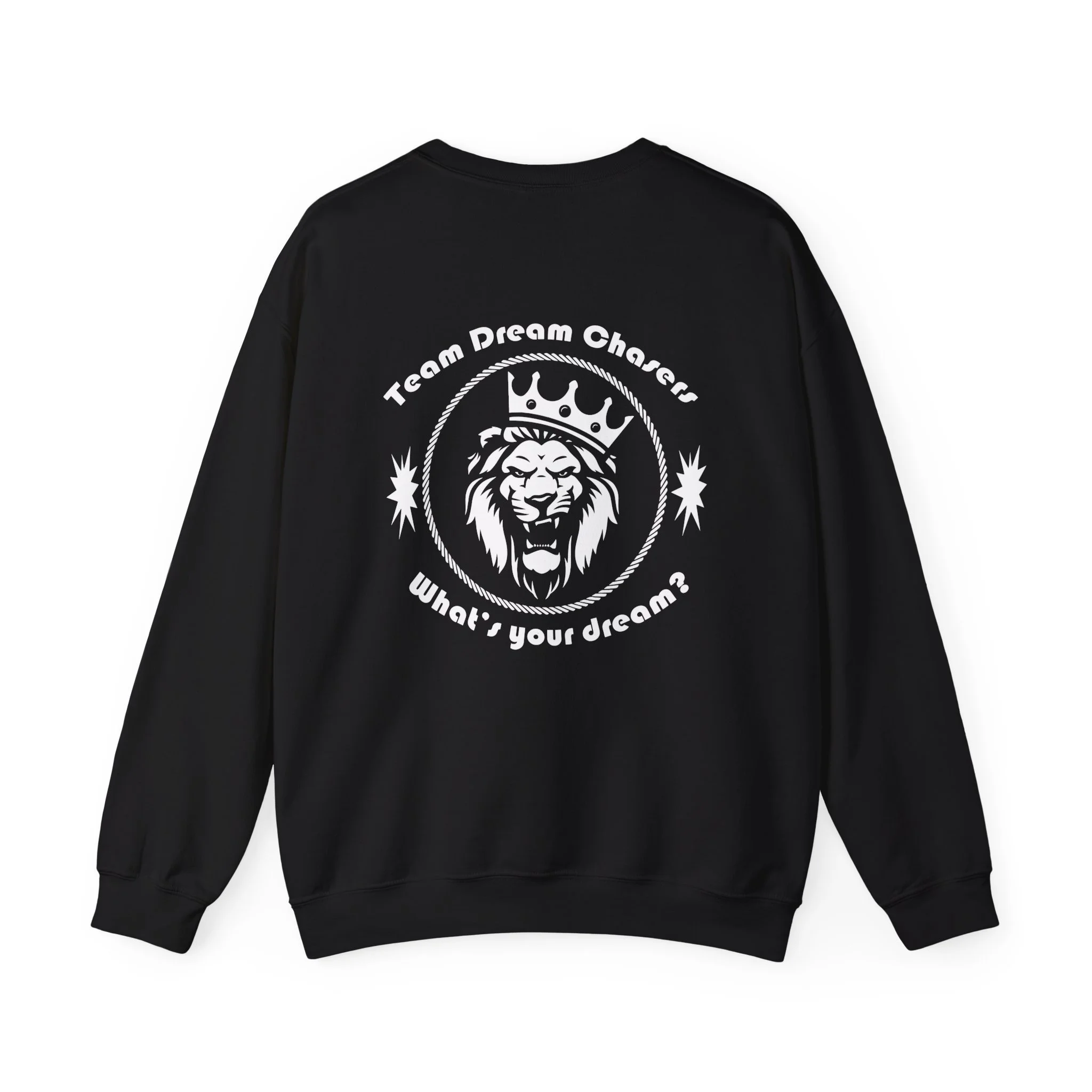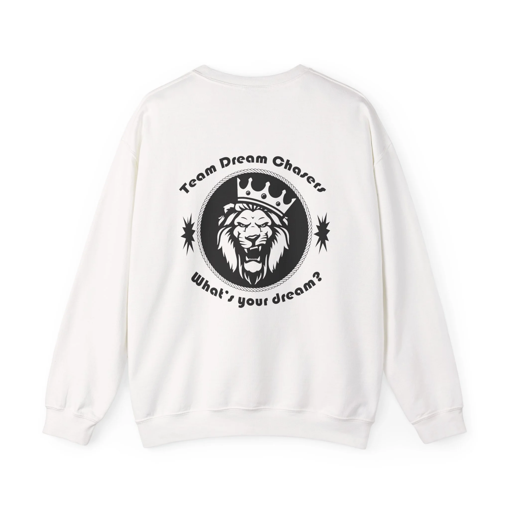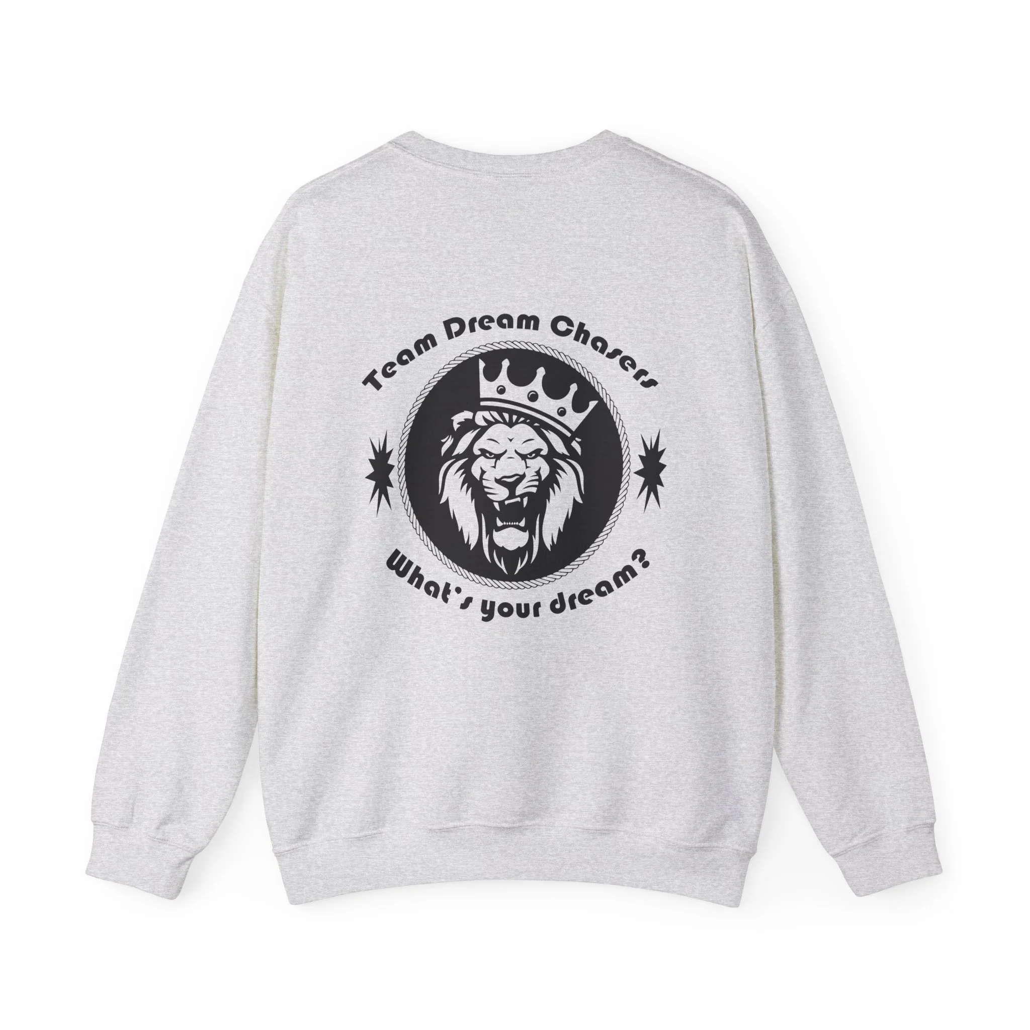 A soft, dependable crewneck that carries quiet confidence. Lightweight but substantial, this sweatshirt drapes cleanly and holds its shape through seasons of wear. The front bears a compact 'TDC Basketball' emblem for understated team pride, while the back centers a bold crowned-lion crest surrounded by the words 'Team Dream Chasers' and the prompt 'What's your dream?'. It feels like the sweater you grab after practice, for late-night drives, or to layer on game day — familiar, durable, and ready to represent the grind. Simple lines and monochrome art give it a street-ready, team-focused vibe that fits both warmups and weekend hangs.
