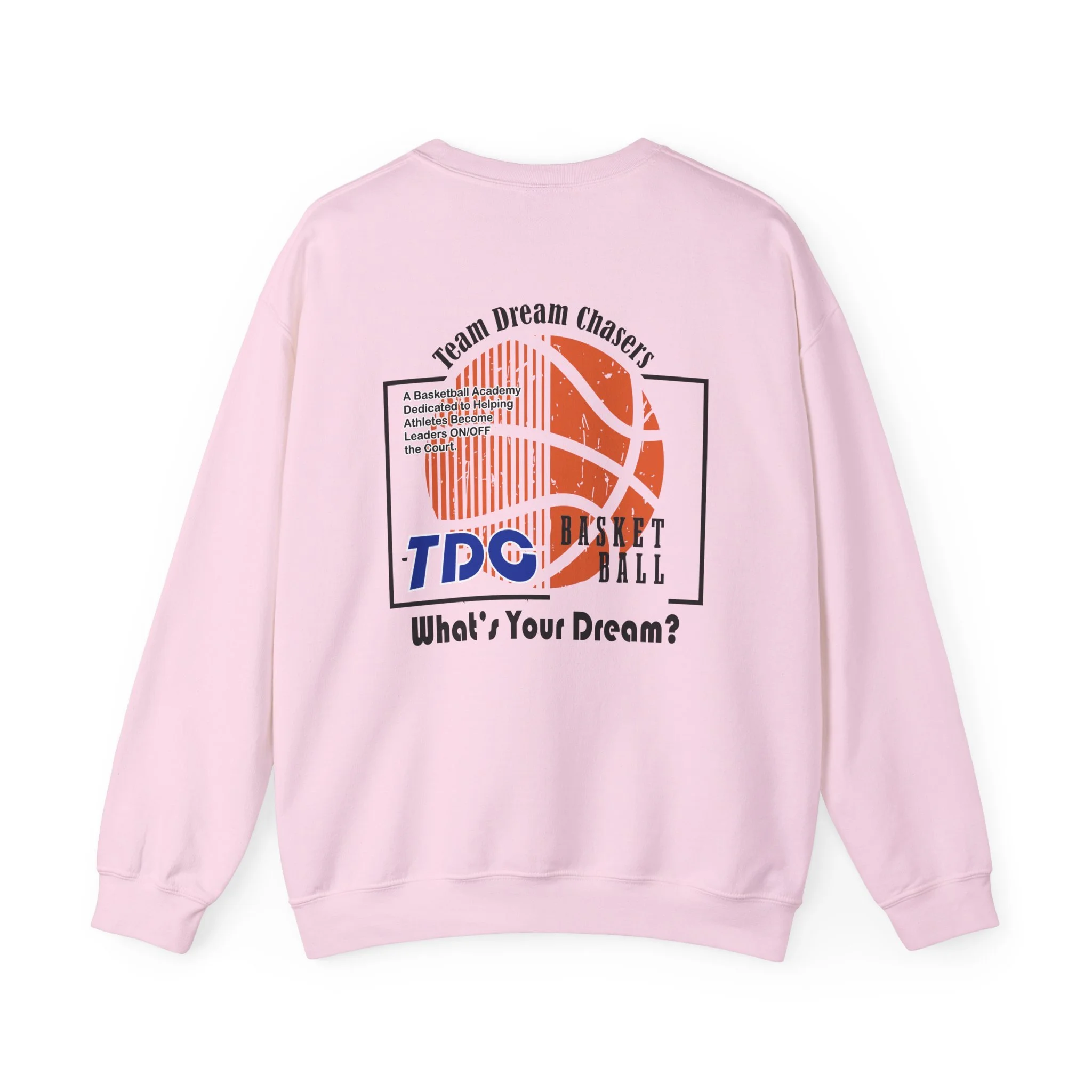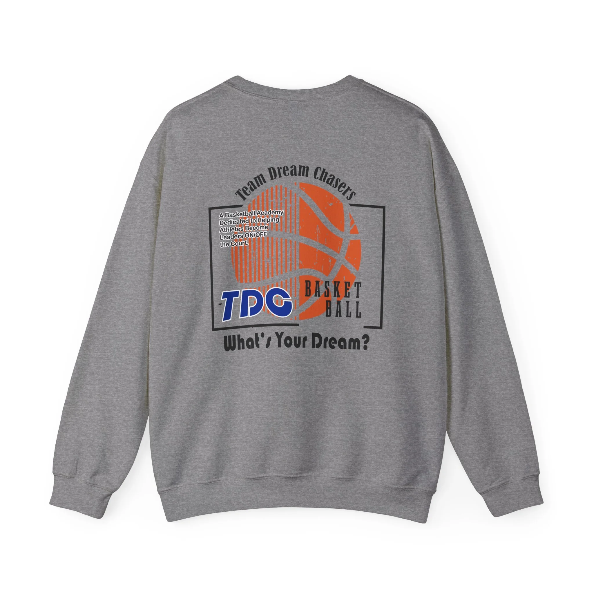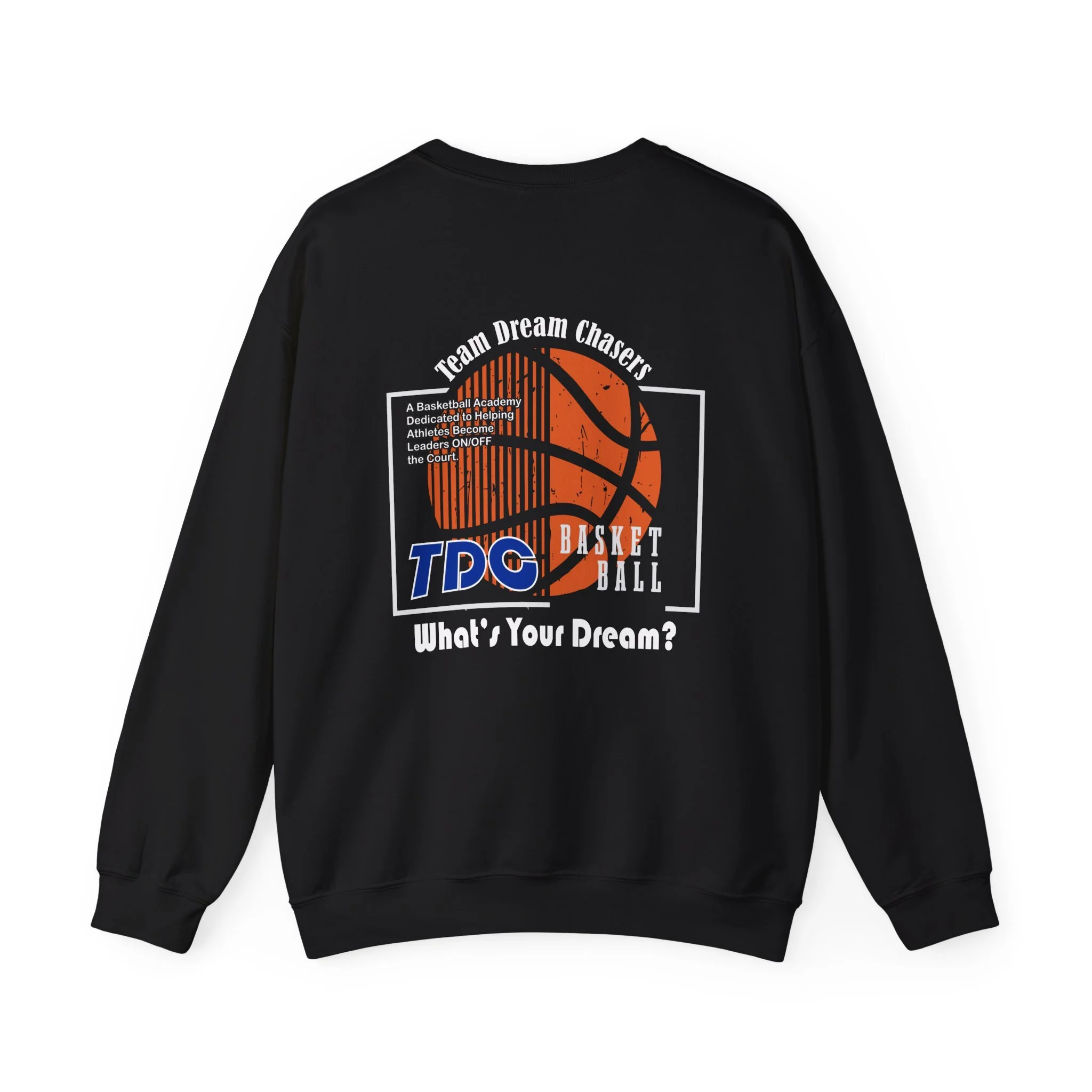 A soft, dependable crewneck that carries quiet confidence. Lightweight but substantial, this sweatshirt drapes cleanly and holds its shape through seasons of wear. The front bears a compact 'TDC Basketball' emblem for understated team pride, while the back centers a bold crowned-lion crest surrounded by the words 'Team Dream Chasers' and the prompt 'What's your dream?'. It feels like the sweater you grab after practice, for late-night drives, or to layer on game day — familiar, durable, and ready to represent the grind. Simple lines and monochrome art give it a street-ready, team-focused vibe that fits both warmups and weekend hangs.