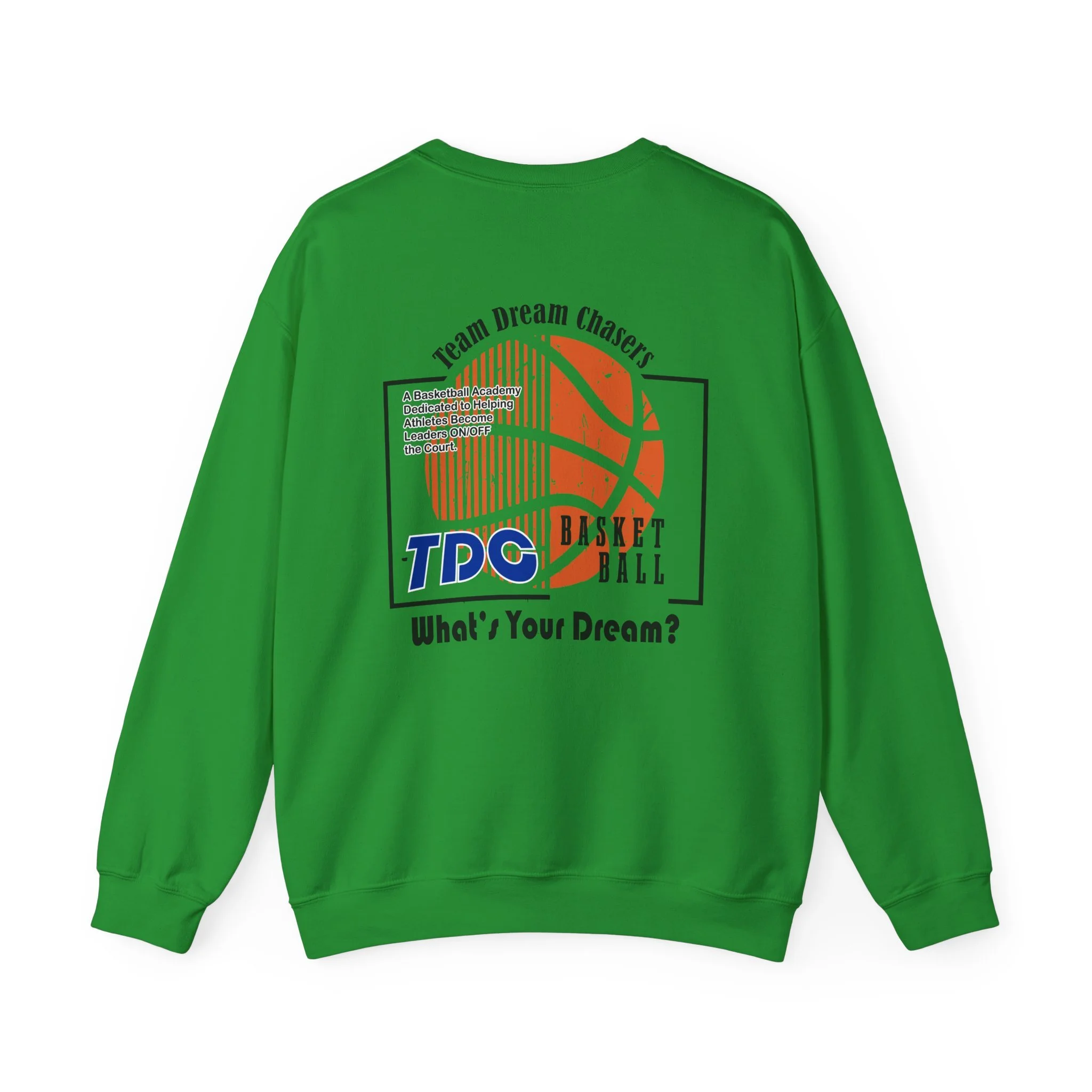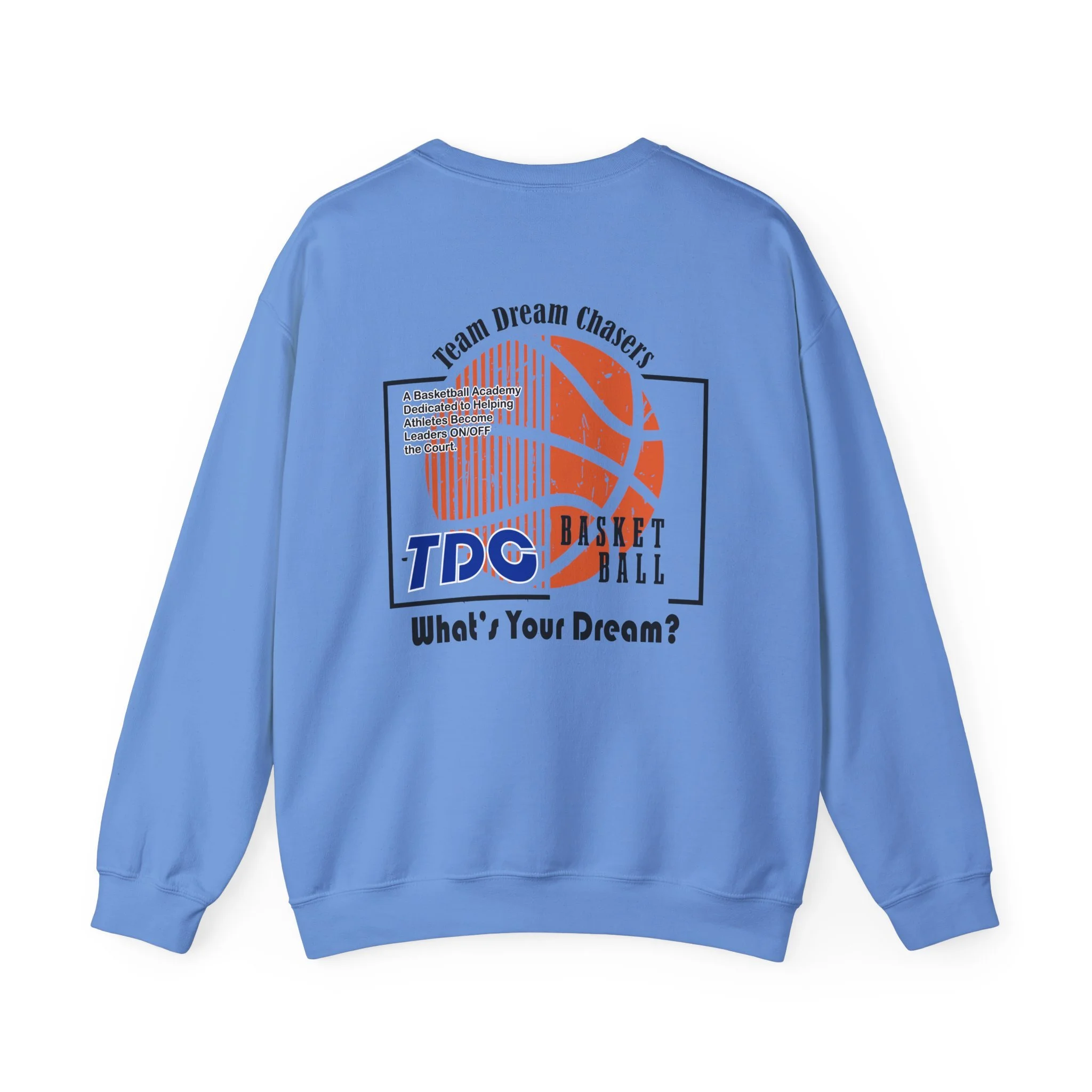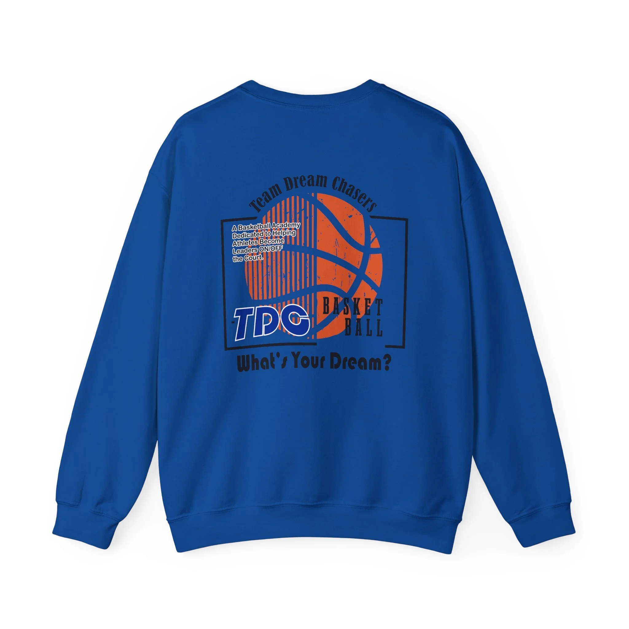 A soft, dependable crewneck that carries quiet confidence. Lightweight but substantial, this sweatshirt drapes cleanly and holds its shape through seasons of wear. The front bears a compact 'TDC Basketball' emblem for understated team pride, while the back centers a bold crowned-lion crest surrounded by the words 'Team Dream Chasers' and the prompt 'What's your dream?'. It feels like the sweater you grab after practice, for late-night drives, or to layer on game day — familiar, durable, and ready to represent the grind. Simple lines and monochrome art give it a street-ready, team-focused vibe that fits both warmups and weekend hangs.